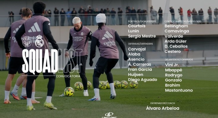 1月23日讯 本轮西甲皇马将在客场迎战比利亚雷亚尔,球队官方也公布了本场大名单,迪亚斯、罗德里戈回归,琼阿梅尼累积黄牌停赛。具体如下:门将:库尔图瓦、卢宁、梅斯特雷后卫:卡瓦哈尔、阿拉巴、劳尔·阿森西奥、卡雷拉斯、弗兰·加西亚、赫伊森、阿瓜多中场:贝林厄姆、卡马文加、巴尔韦德、居莱尔、塞巴...