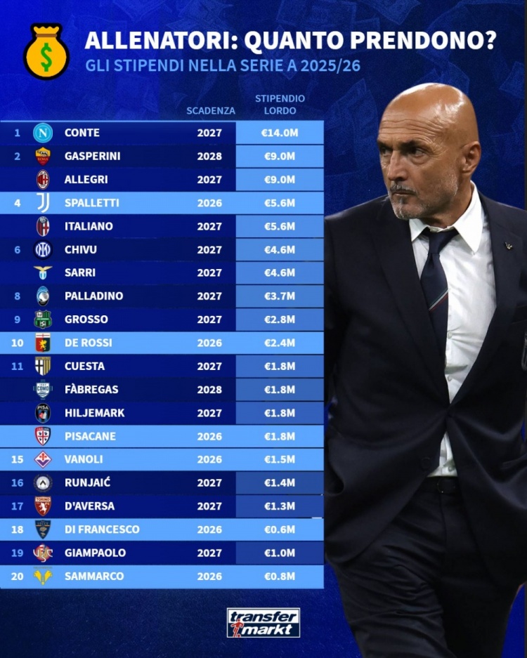 意甲各队主帅年薪排行:孔蒂1400万欧居首,阿莱格里900万欧次席